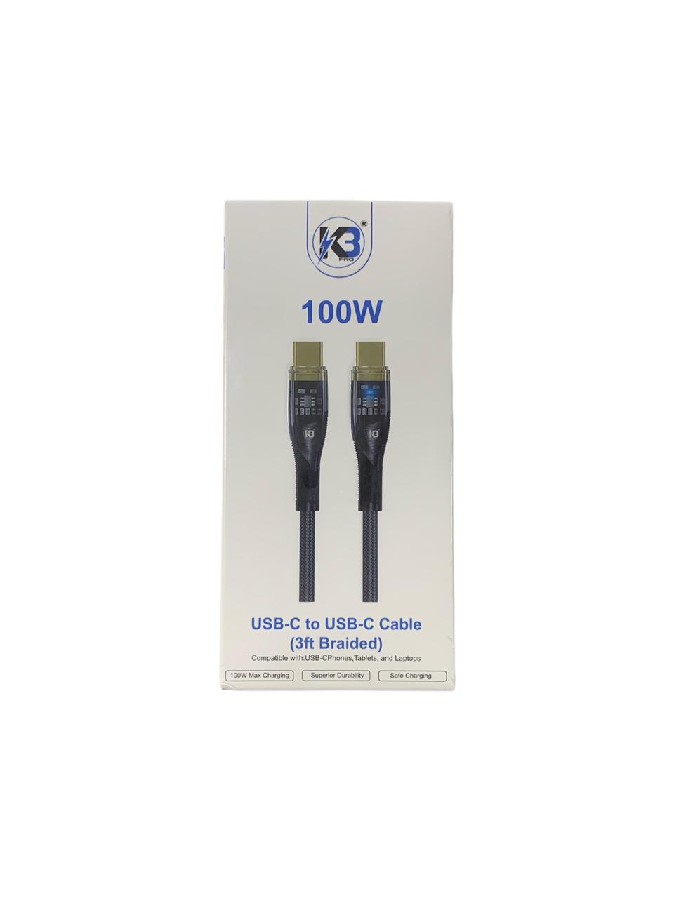 وصلة K3 بقدرة 100 واط (100W PD) ومنفذ USB-C إلى USB-C بطول 1 متر شحن سريع فائقة المتانة، . تدعم شحن الهواتف الذكية، الأجهزة اللوحية، وأجهزة اللابتوب (مثل MacBook) بسرعة عالية.